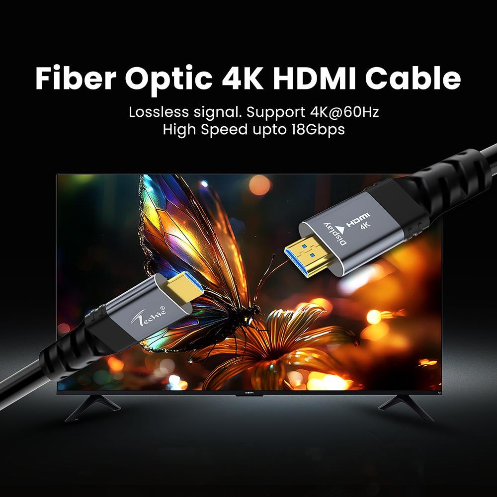 Elevate your viewing with Techie Optic fiber HDMI Cable, delivering flawless 4K@60Hz signals over long distances for stunning visuals and sound.